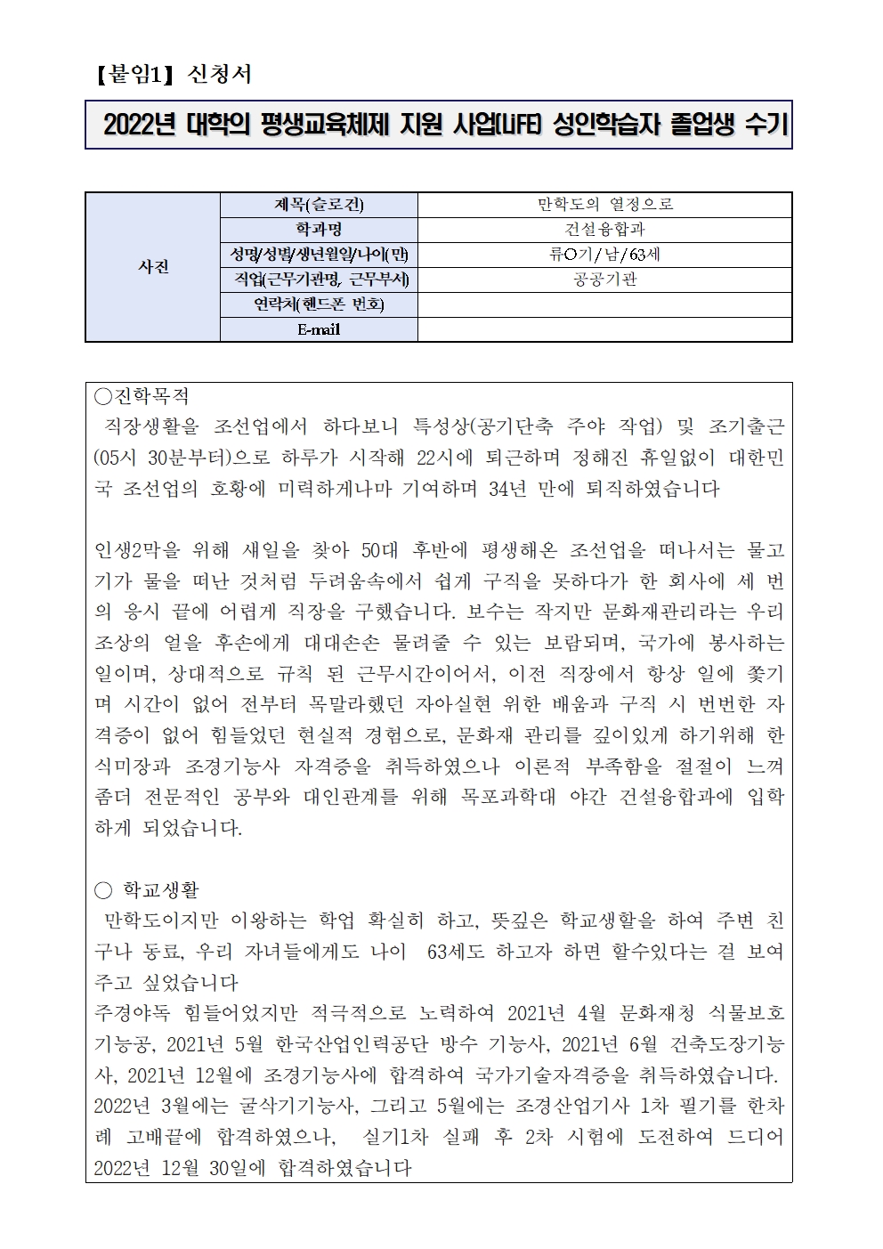 [2022년 LiFE사업 성인학습자 졸업생 수기][건설융합과_류O기]